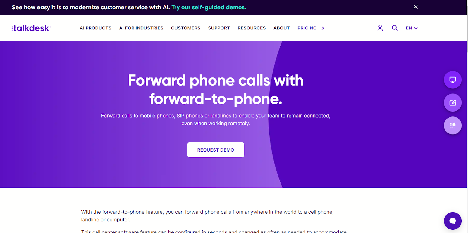 Talkdesk offers a range of features including the ability to forward calls to any phone, be it mobile, landline, or computer. This enables employees to work remotely and stay connected with their customers. Additionally, Talkdesk provides local and toll-free numbers that can be forwarded to agents anywhere, allowing businesses to expand their international presence.