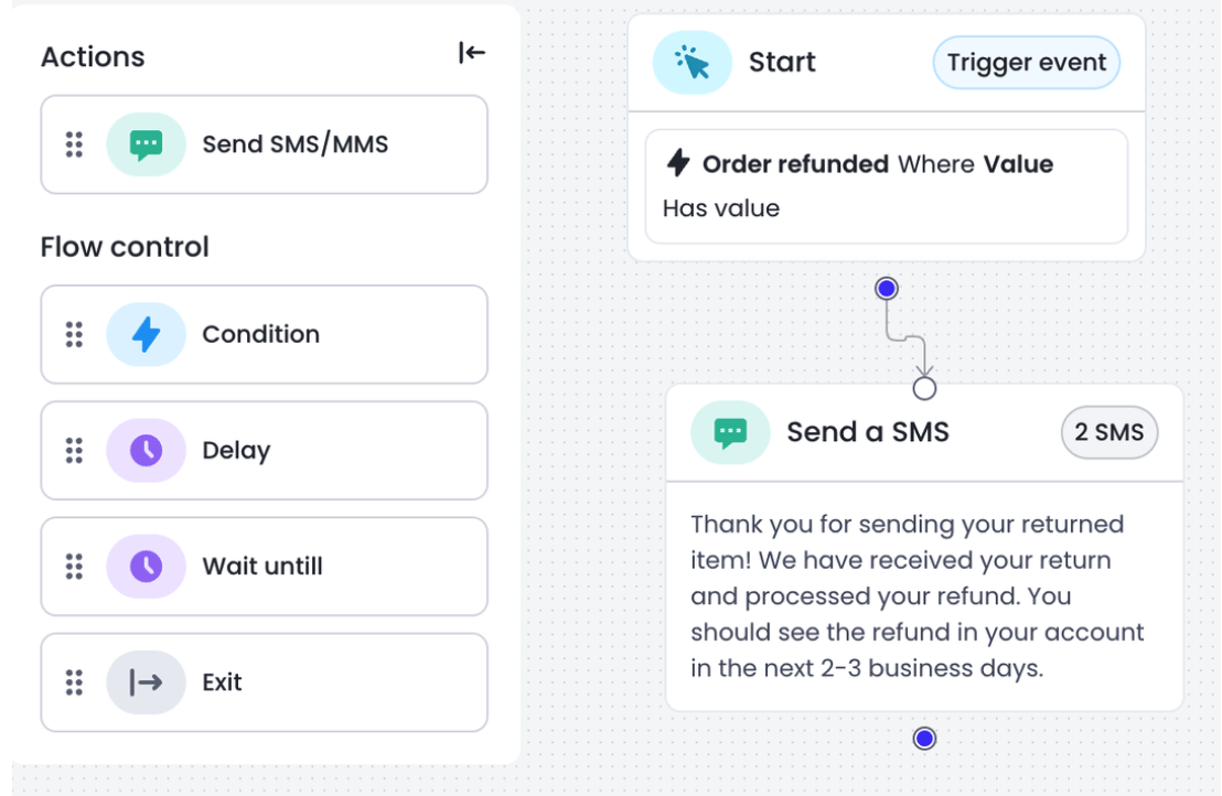 With Journeys, you are also in control of the timing of a message. For example, whenever a customer returns a product, you can send a feedback survey after 1 day to gauge what they didn’t like about the product.
