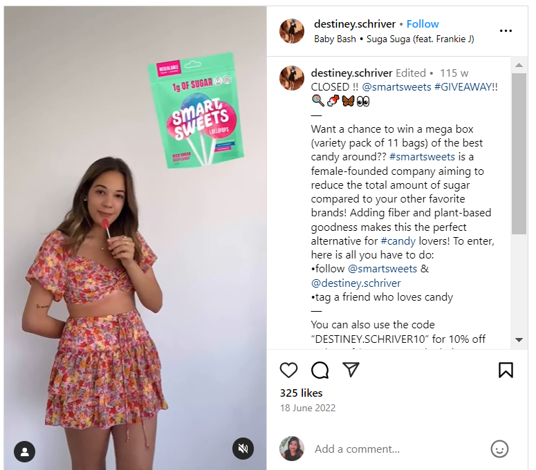 Example of influencer giveaways