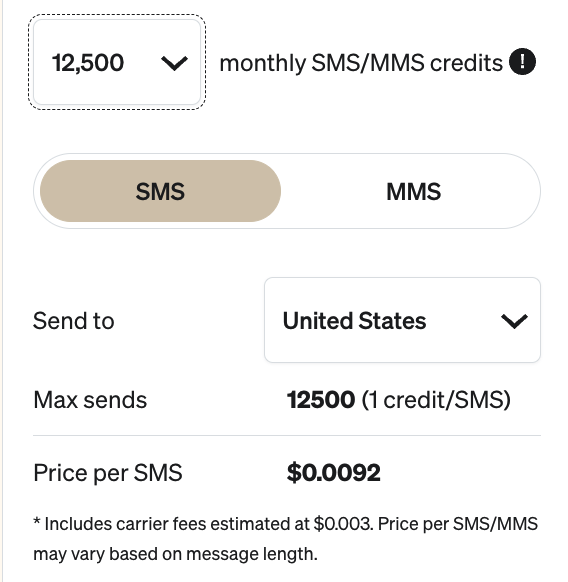 | Carrier Fees (US) | Included; carrier fees estimated at $0.003. Price per SMS/MMS may vary based on message length. |