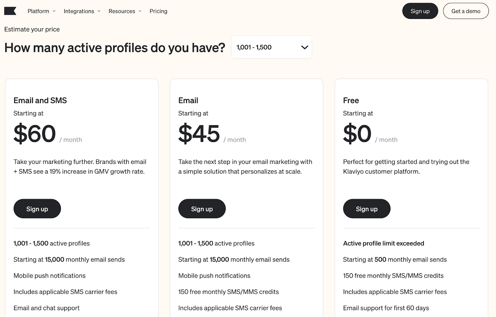 Additionally, Klaviyo offers a tiered pricing system. For instance, you'll pay a flat fee of $60 for 1,001-1,500 active profiles. This means whether you have 1,200 or 1,500 contacts, the cost remains the same.