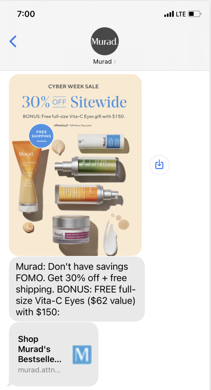 For example, Murad Skincare’s taps into customer FOMO with its Cyber Week Sales SMS. It offers a package of deals—30% off, shipping, and an enticing bonus.