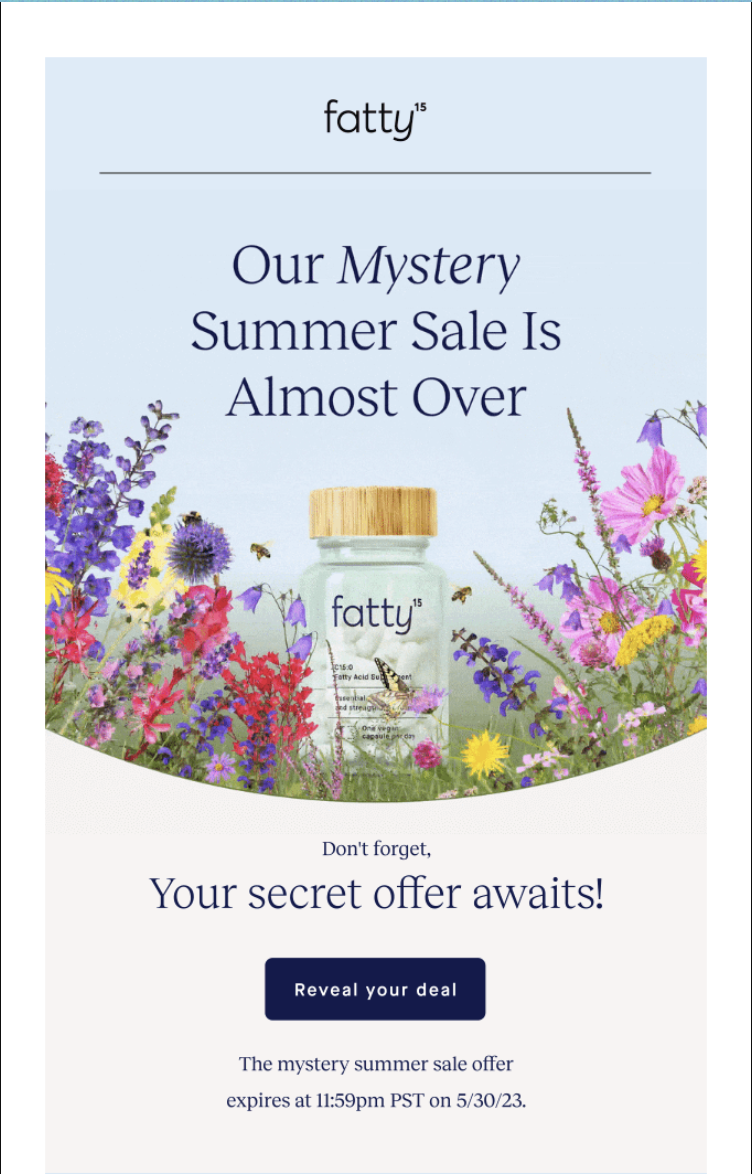 For example, Fatty15 taps into the curiosity trigger via its mystery email. It motivates buyers to seal the deal before the time runs out without mentioning what’s in the offer.