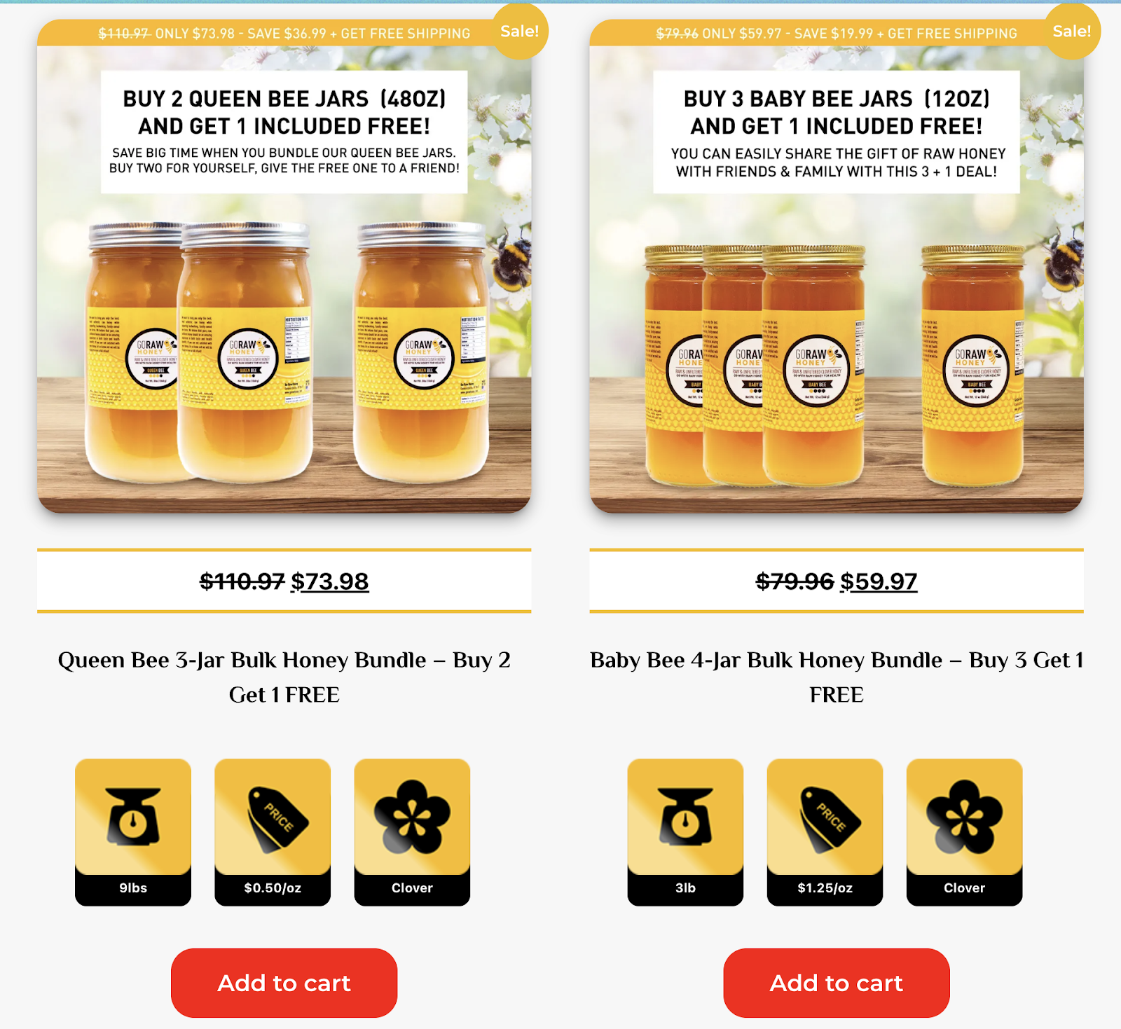 Check out this BOGO offer by GoRaw Honey. They offer bundles of honey packages and lucrative deals like buy 3, get two free. Bundling similar items together entices bulk purchases, leading to higher average order values.