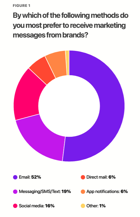 In fact, according to the Validity report from 2023, 19% of consumers prefer getting messages via SMS, which is higher than social media (16%), app notifications (6%), and direct mail (6%).