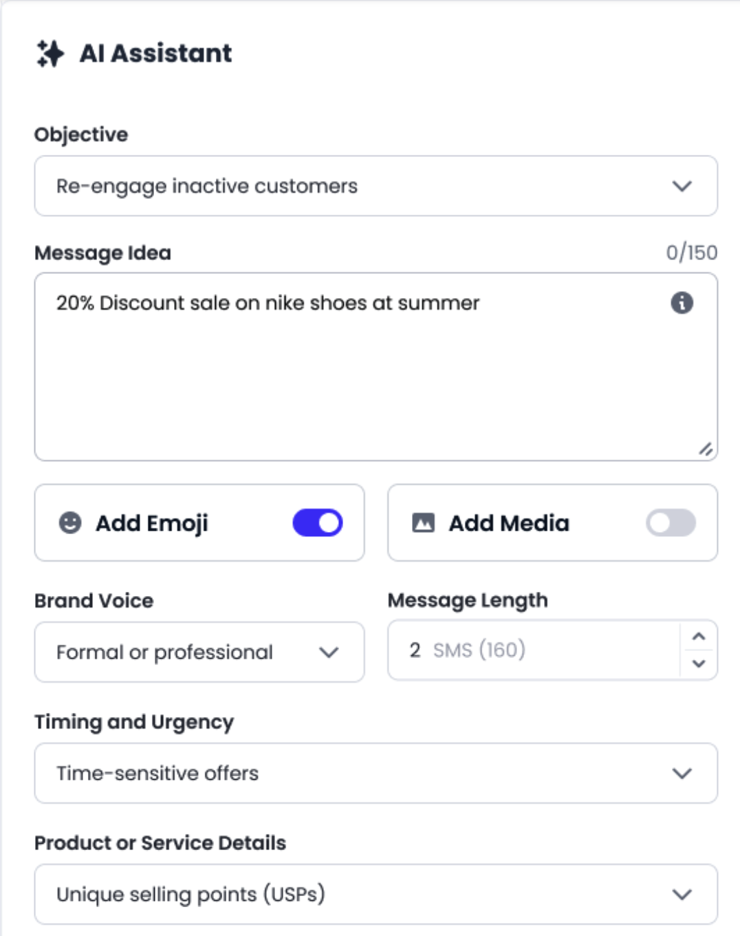 - Copywriter AI: Generate compelling SMS copy tailored to your goals, brand tone or urgency level