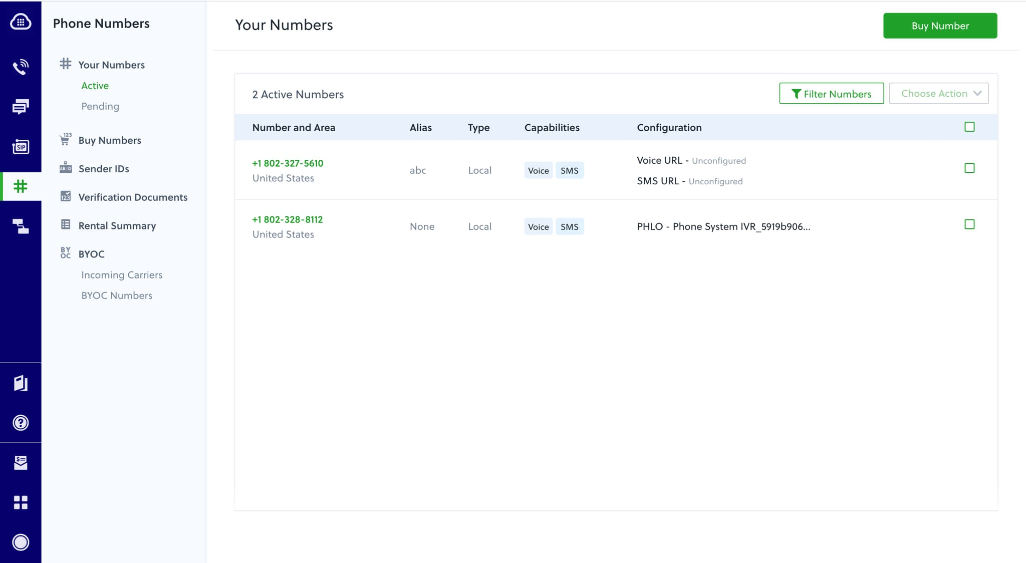 - Easier UI for configuring phone numbers: We’ve eliminated multiple steps so that you can see the phone number configuration in the same panel where you see Your Numbers, and you can modify or attach a number to an application from the same screen.