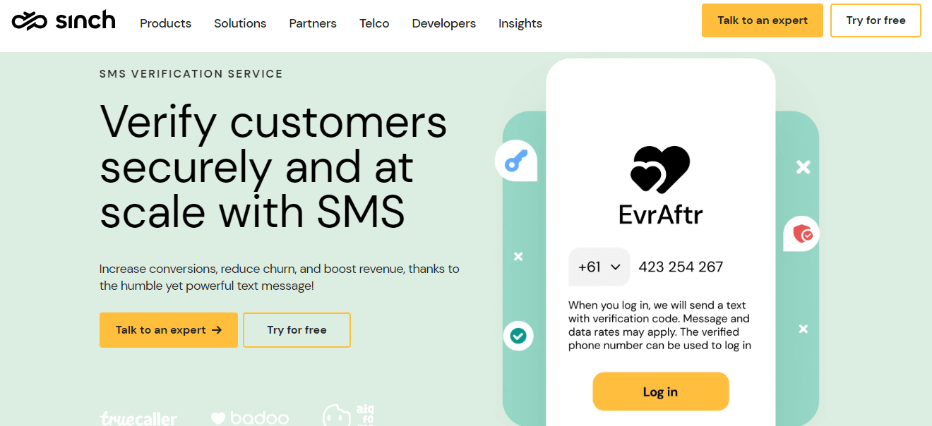 | Sinch | Strong customer support Well documented APIs | 150+ countries | 600+ | Offers free trial Monthly fee starts from $100 | G2: 3.9/5 (29 reviews) |