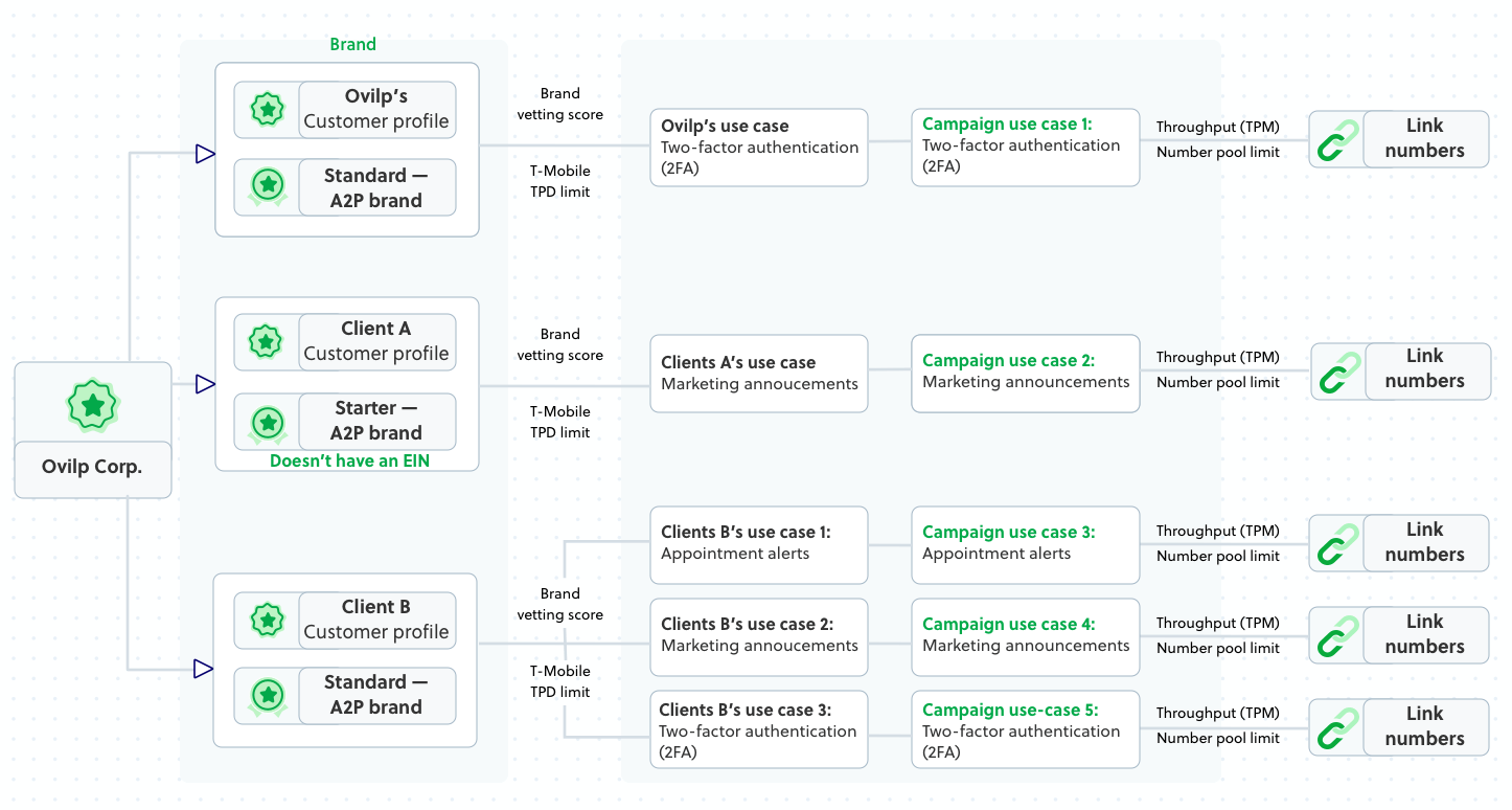 For example, consider a hypothetical messaging platform for businesses in the United States Ovilp Corp. It should register its own brand and each of its customers' brands as individual brands.