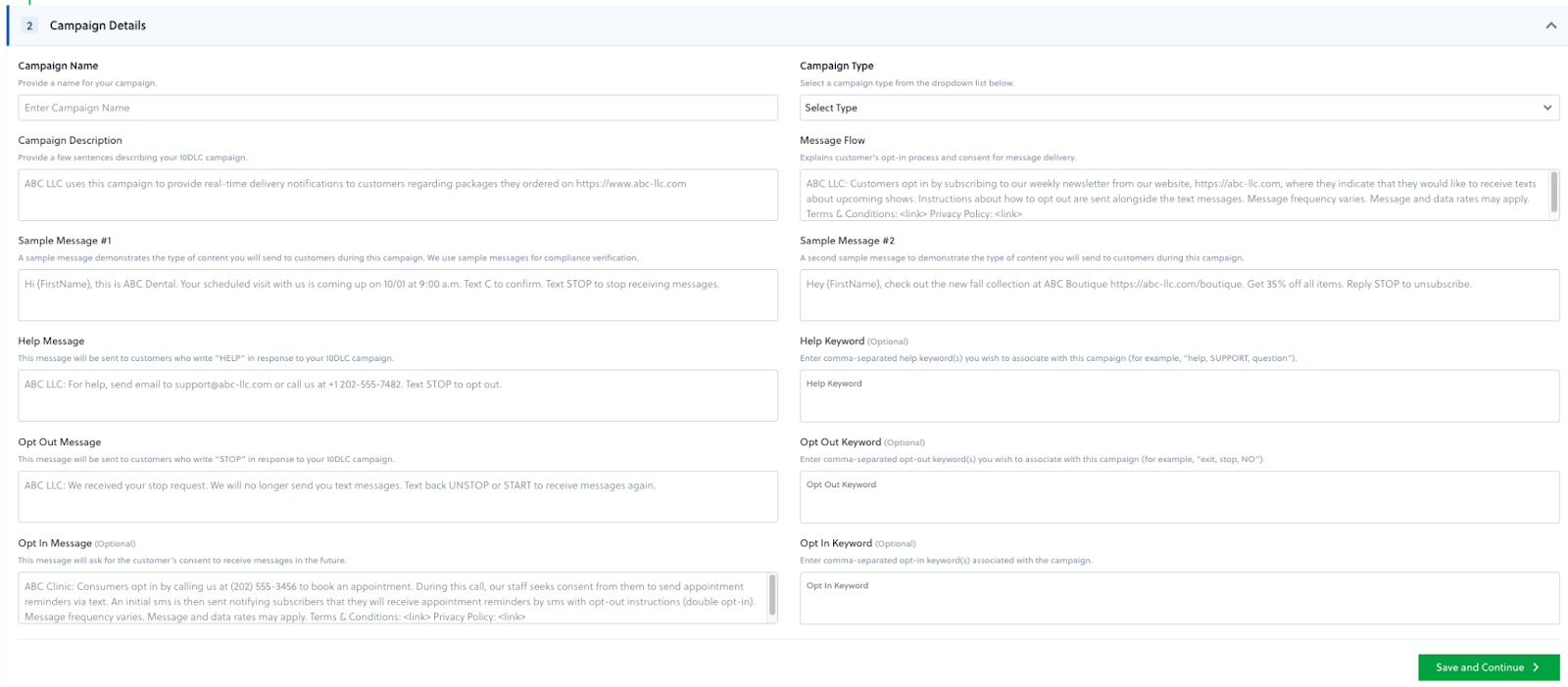 You might also have to submit extra information depending on your A2P provider. Some A2P providers offer pre-defined campaign categories to choose from, while others might ask you to create custom campaigns.