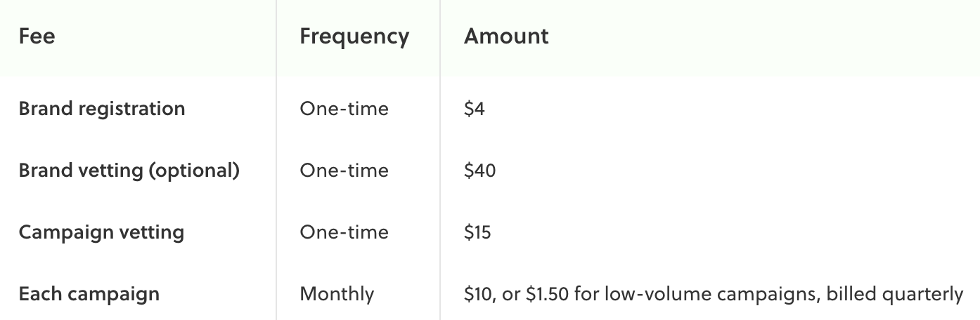 This is a one-time fee to register your brand with the registry. It costs $4 for sole proprietors and low volume standard brands (those that have less than 6,000 messages per day).