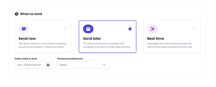 - Send now or later: Manage and schedule campaigns for optimal timing and ROI