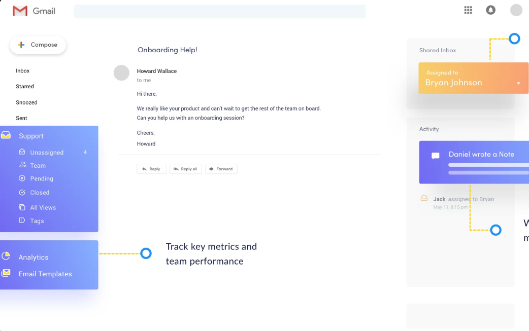 Start by installing Hiver on a common Gmail account that your team uses to handle customer queries (such as support@yourcompany.com). The tool then lets you assign incoming emails to team members, categorize them based on the query type, resolution status, and priority, and collaborate on them to resolve customer issues.