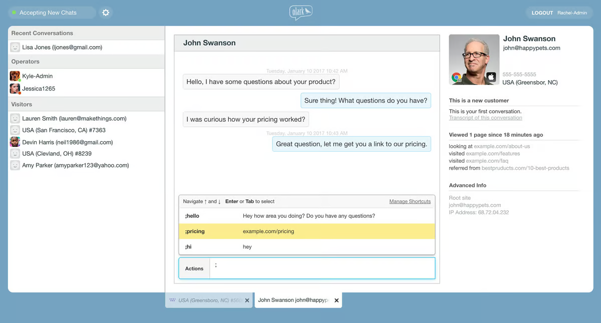 Moreover, Olark’s live chat analytics monitors customer satisfaction, chat volume, and agent performance.