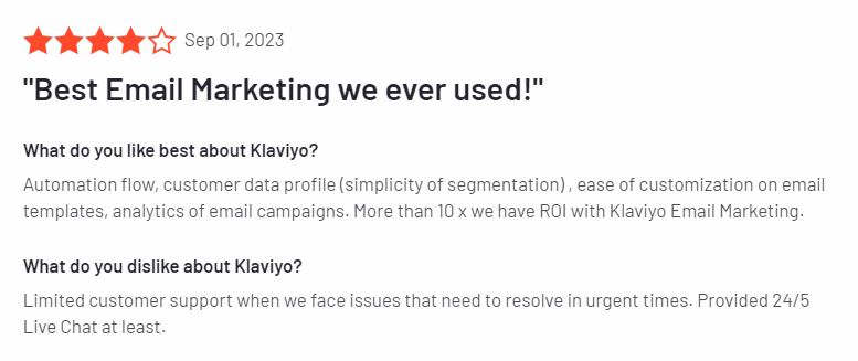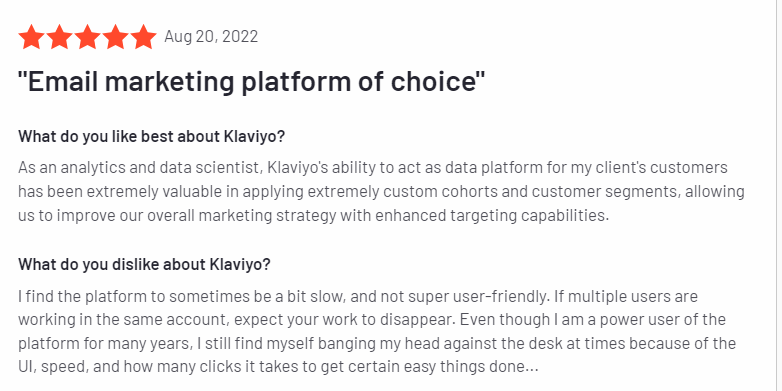 | Klaviyo | Email, SMS, and push notification channels | Free trial available with limited features. Paid plans start at $945 per month supporting 100,000 email credits. | Extensive features and integrations | Expensive; Slowness in the platform; Poor customer support |