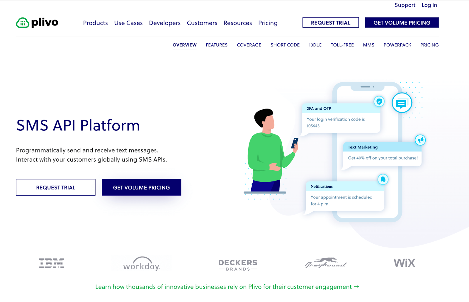 Sending SMS is simple and affordable with Plivo. We’re trusted by thousands of businesses including IBM, Workday, Deckers, Greyhound, and Wix. Our SMS API platform programmatically sends and receives text messages to customers worldwide easily and efficiently. We support over 220 countries and territories, and let you customize your sender ID in 100 countries outside of the US and Canada.
