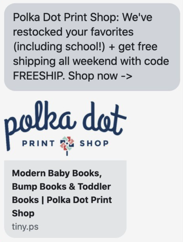 Polka Dot Print Shop sends an alert about their restocked items. They also provide a code for free shipping so customers are more tempted to buy them.