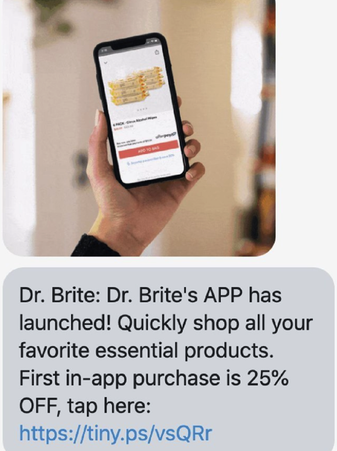 Dr. Brite promotes its newly launched app where customers can get 25% off - a great way to promote a new platform while selling more products.