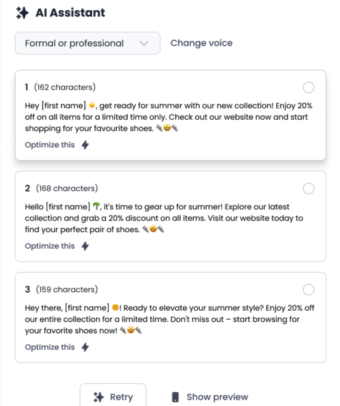 Copywriter AI will provide message options so you can select and fine-tune the copy before sending.