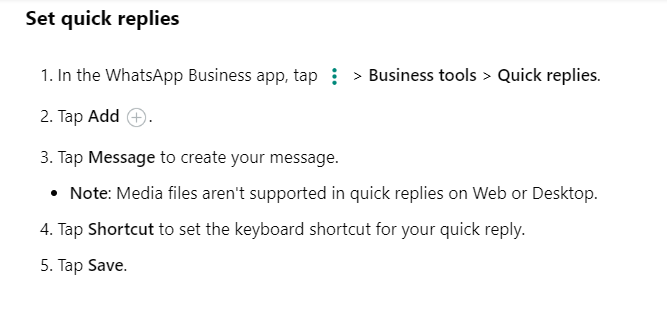 - WhatsApp quick replies: Quick replies offer pre-saved responses to answer frequent questions or common inquiries instantly. Set these up to save time and maintain consistent communication.