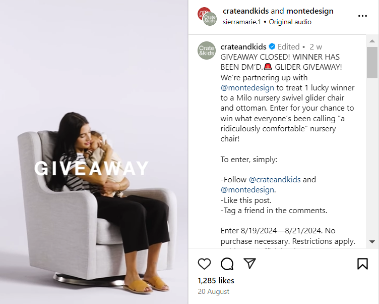 Crate and Kids (a baby products brand) and Monte Design (a future brand) partnered together to run a giveaway. They promoted a nursery chair, which was relevant to both brands' audiences.