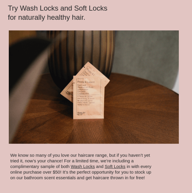 Ashley & Co, a luxury brand, offered free samples of their products for all purchases above $50. This move was to make customers familiar with all ranges in product lines.