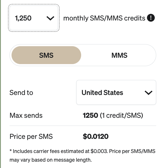 | Carrier Fees (US) | Included; carrier fees estimated at $0.003. Price per SMS/MMS may vary based on message length. |