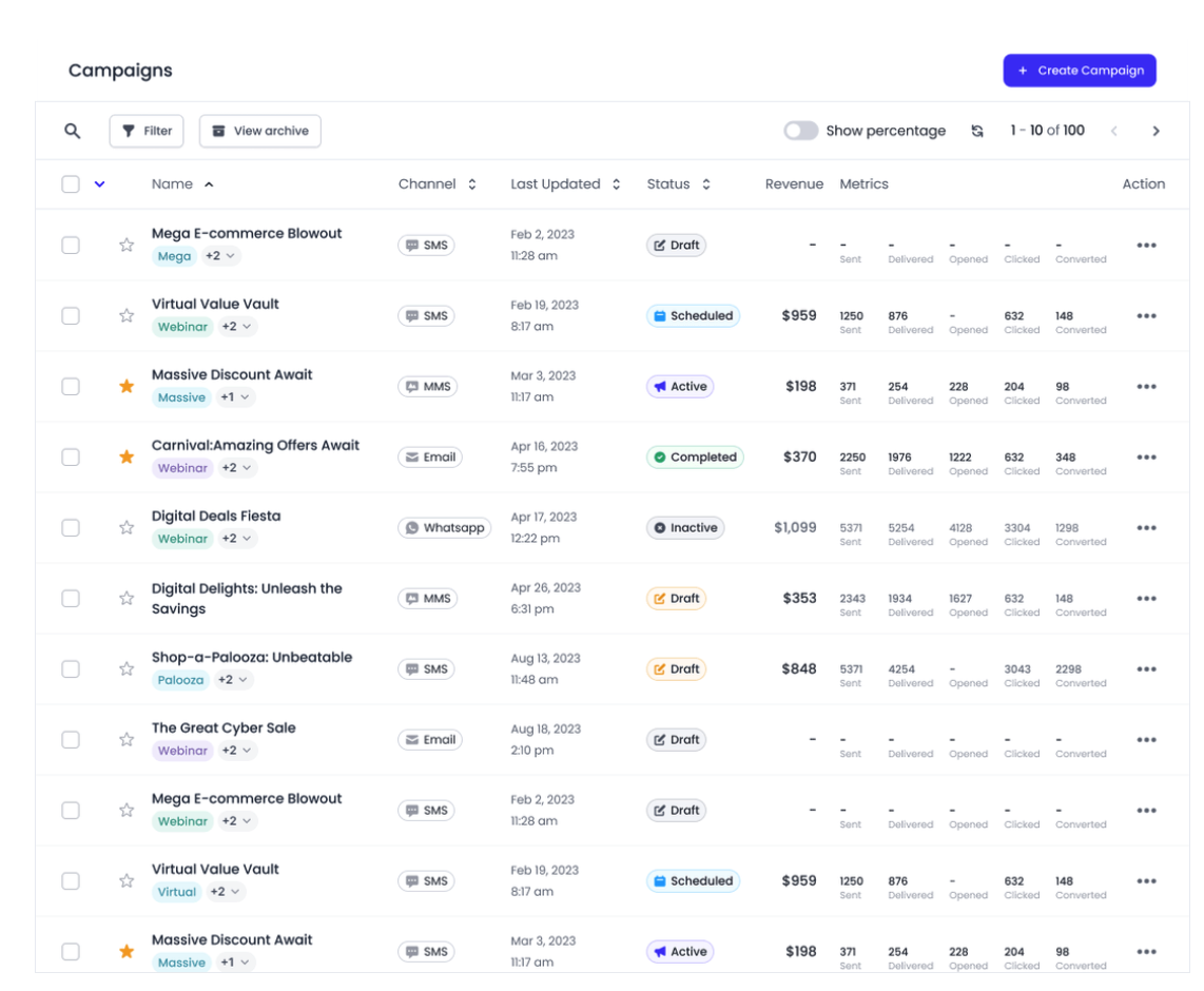 - Channels: Reach customers on their preferred channels, including SMS, MMS, and email, so that your brand stays top of mind and customers are more likely to convert.