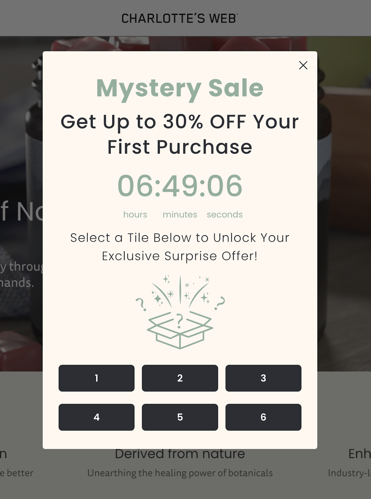 Charlotte’s Web promotes mystery discounts using a countdown and sale offers packed with website pop-ups. They reveal a maximum discount offer and gamify the reveal by urging customers to pick a tile to reveal the discounted amount.