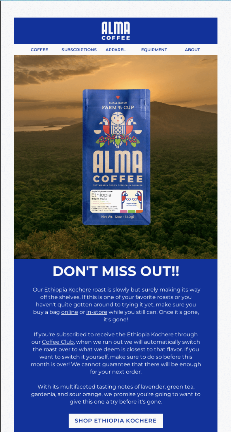 Alma Coffee builds urgency among its customers by sending a low-stock alert email. The company intensifies the scarcity level by highlighting that it will only restock the item for a while if it runs out.