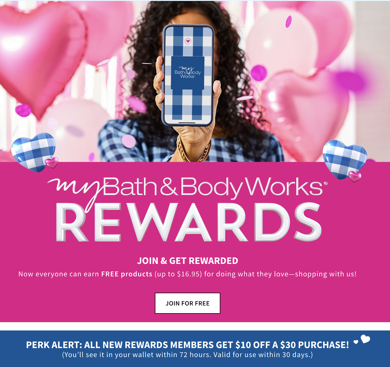 Bath and Body drives new member sign-ups with two offers—a free product and a $10 off coupon with 30 days validity.