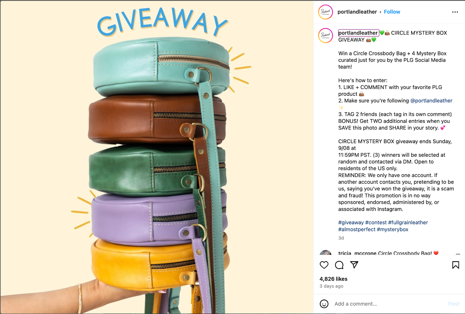 For example, Portland Leather ran a limited time giveaway of their circle crossbody bag and a mystery box. The brand outlined the giveaway’s instructions on their Instagram posts, including offer details, duration, and winning criteria. Within three days, the post generated over 7k comments.
