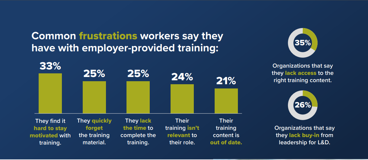 There's a significant disconnect between employee needs and employer-provided training. While 88% of staff report inadequate training for the apps they use, 35% of companies admit lacking the right learning materials.