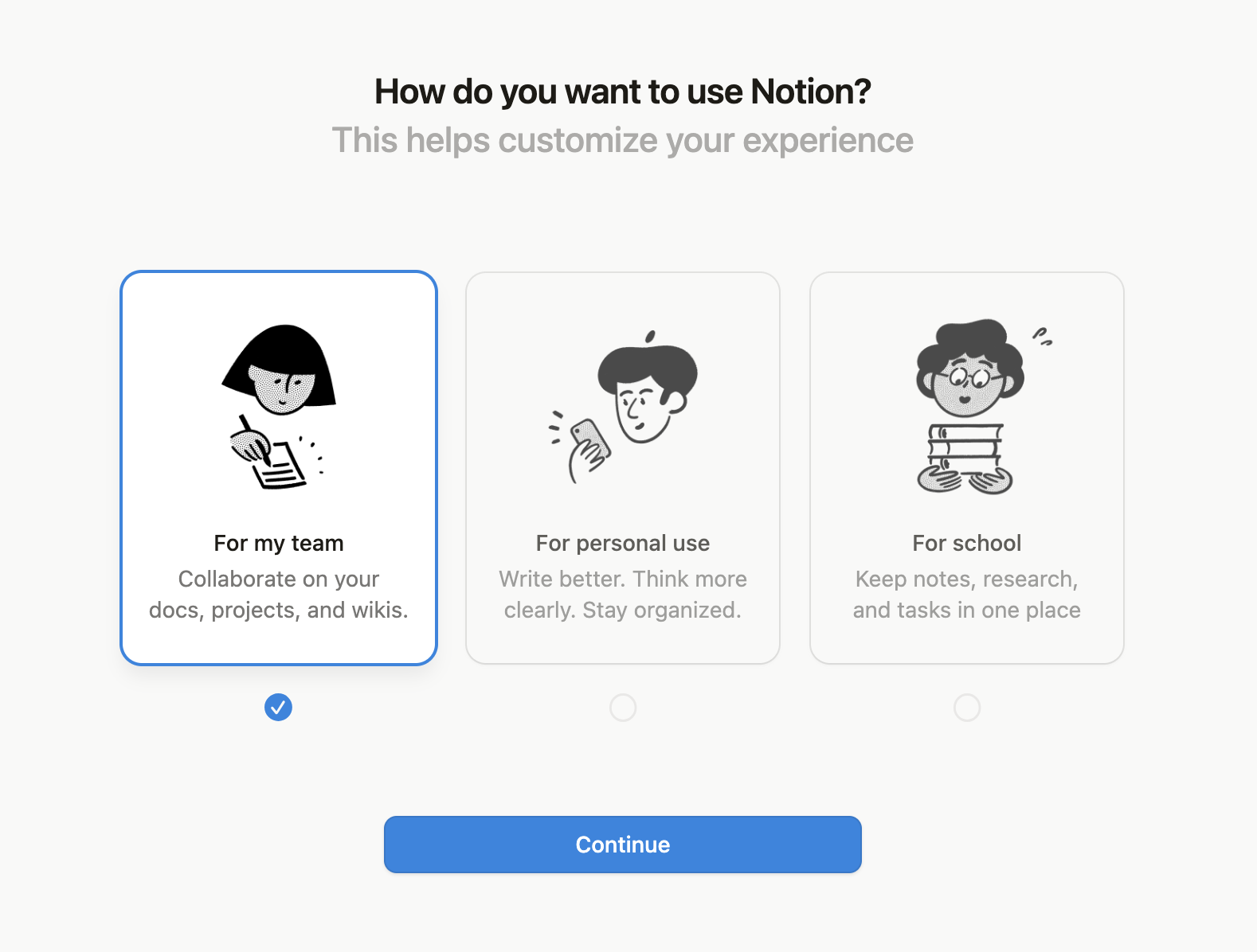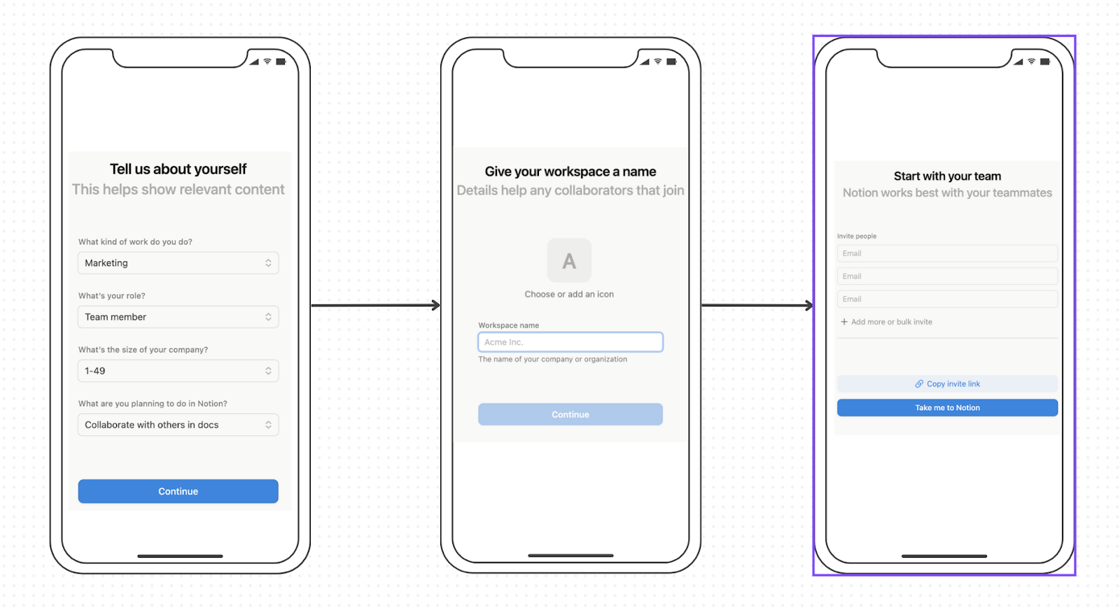 Take Notion’s onboarding flow, for instance. After signing up, the app asks you how you’d like to use it to tailor your user experience accordingly.