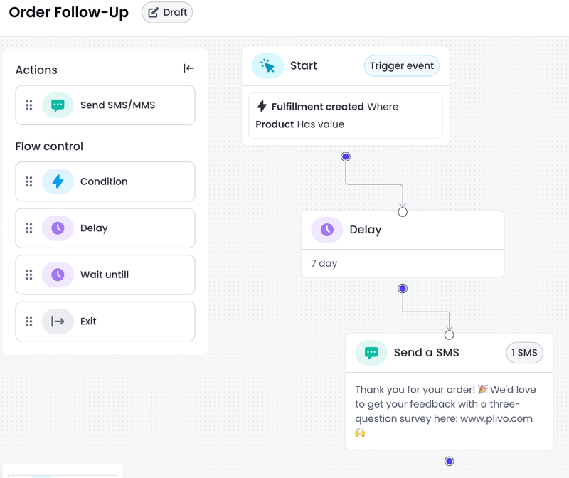 With clarity of triggers and messages, the only task left to get started is setting up the workflow. Set up triggers and respective messages in your SMS marketing automation platform.