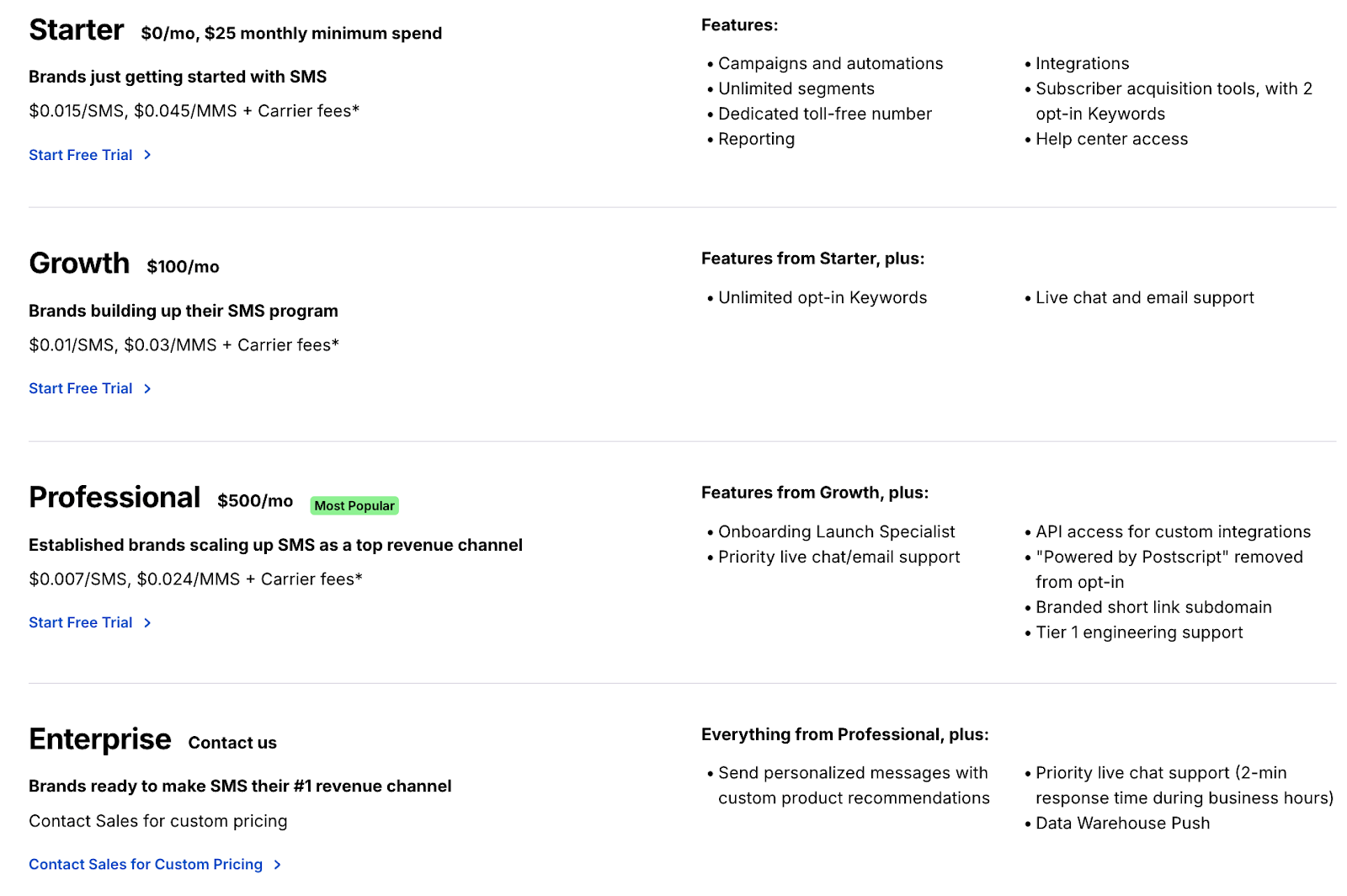 - AI-powered features: Postscript uses AI to optimize campaigns, including its AI Infinity Testing, which continuously tests and refines message variants to drive an average 20% revenue lift.