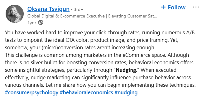 Oksana Tsvigun, an eCommerce expert, says, "When executed effectively, nudge marketing can significantly influence purchase behavior across various channels."