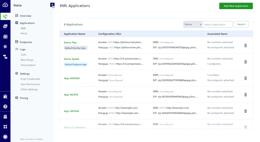 - Optimized view of application configuration: Now you can see at a glance all the details of your application configuration — phone numbers, all associated URLs for both voice and SMS, and SIP endpoints — without having to click through multiple layers to verify or modify the application configuration.