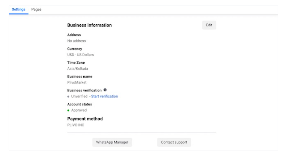 - Next, click on the Settings tab within Meta Business Manager. You should see ‘PLIVO INC’ listed under the payment method, indicating that Plivo now manages your payments.