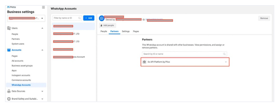 - Verify onboarding by navigating to your Meta Business Account, selecting your Meta account, and going to Business Settings. Click on WhatsApp Accounts and open the Partners tab. You should see Plivo listed as one of your partners.