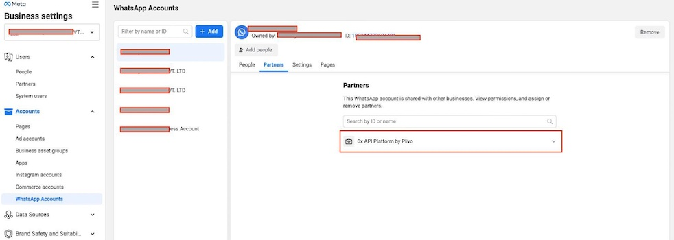 - In Business Settings, select WhatsApp Accounts and check the Partners tab — Plivo should be listed there as one of your partners.