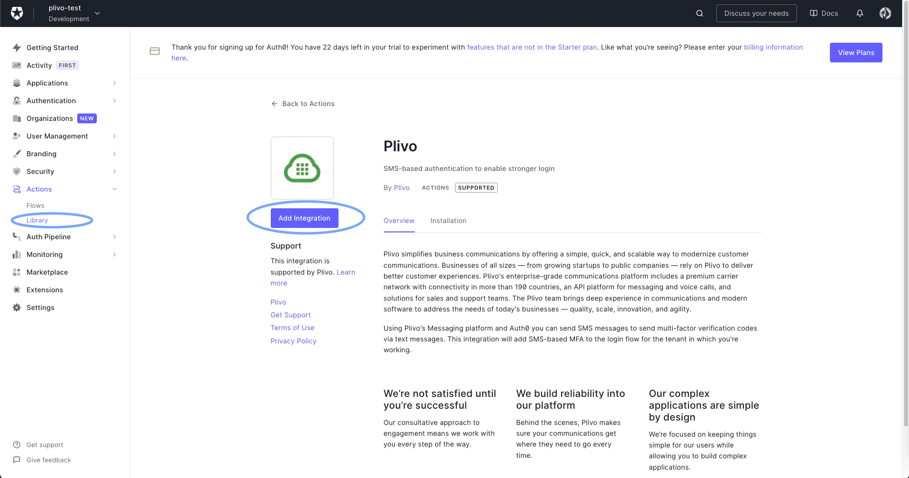 Configure the integration by filling in the fields on the next screen with your Plivo Auth ID and Auth Token and your Plivo phone number.