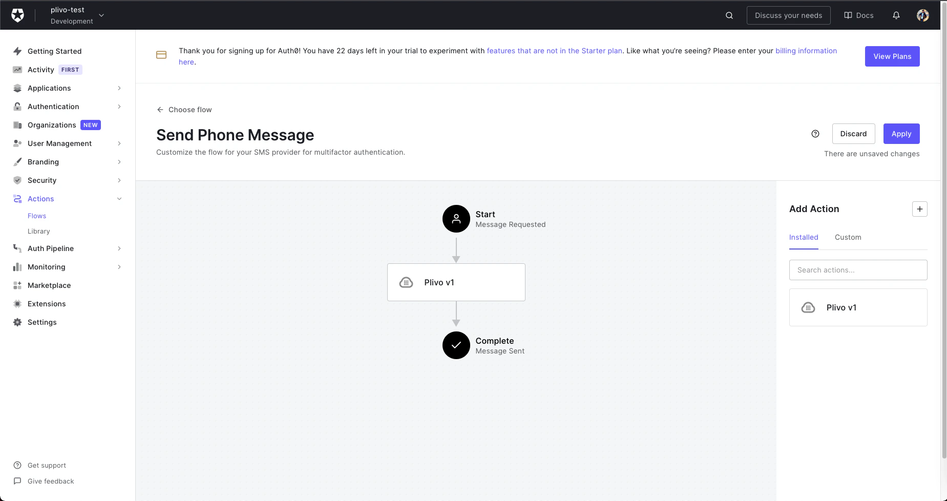 - Click Apply Changes. Now this flow will use the Plivo integration to send an SMS message whenever it’s called.