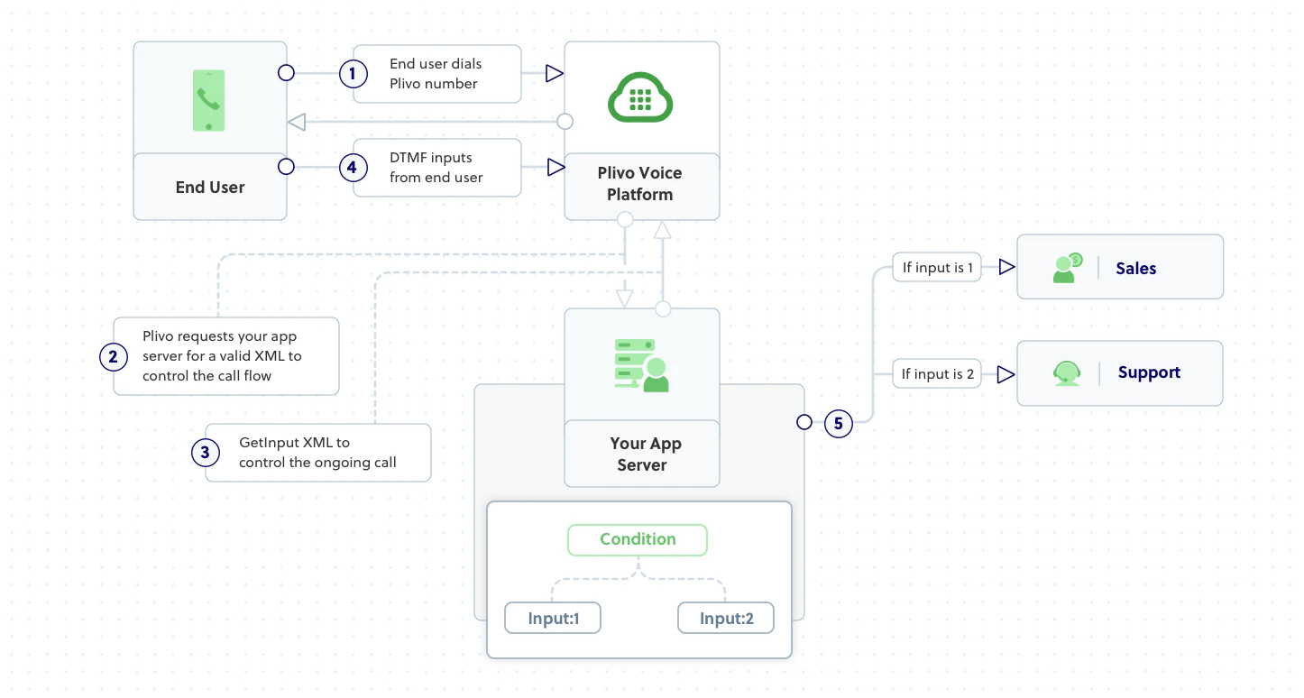 This guide shows how to build an IVR menu system on the Plivo platform, either by using our PHLO visual workflow builder or our APIs and XML documents. Follow the instructions in one of the tabs below.