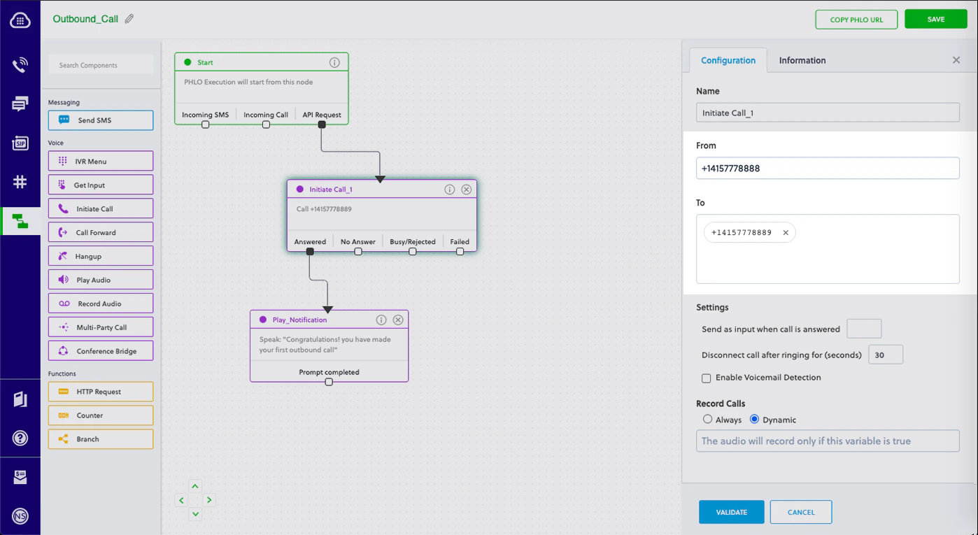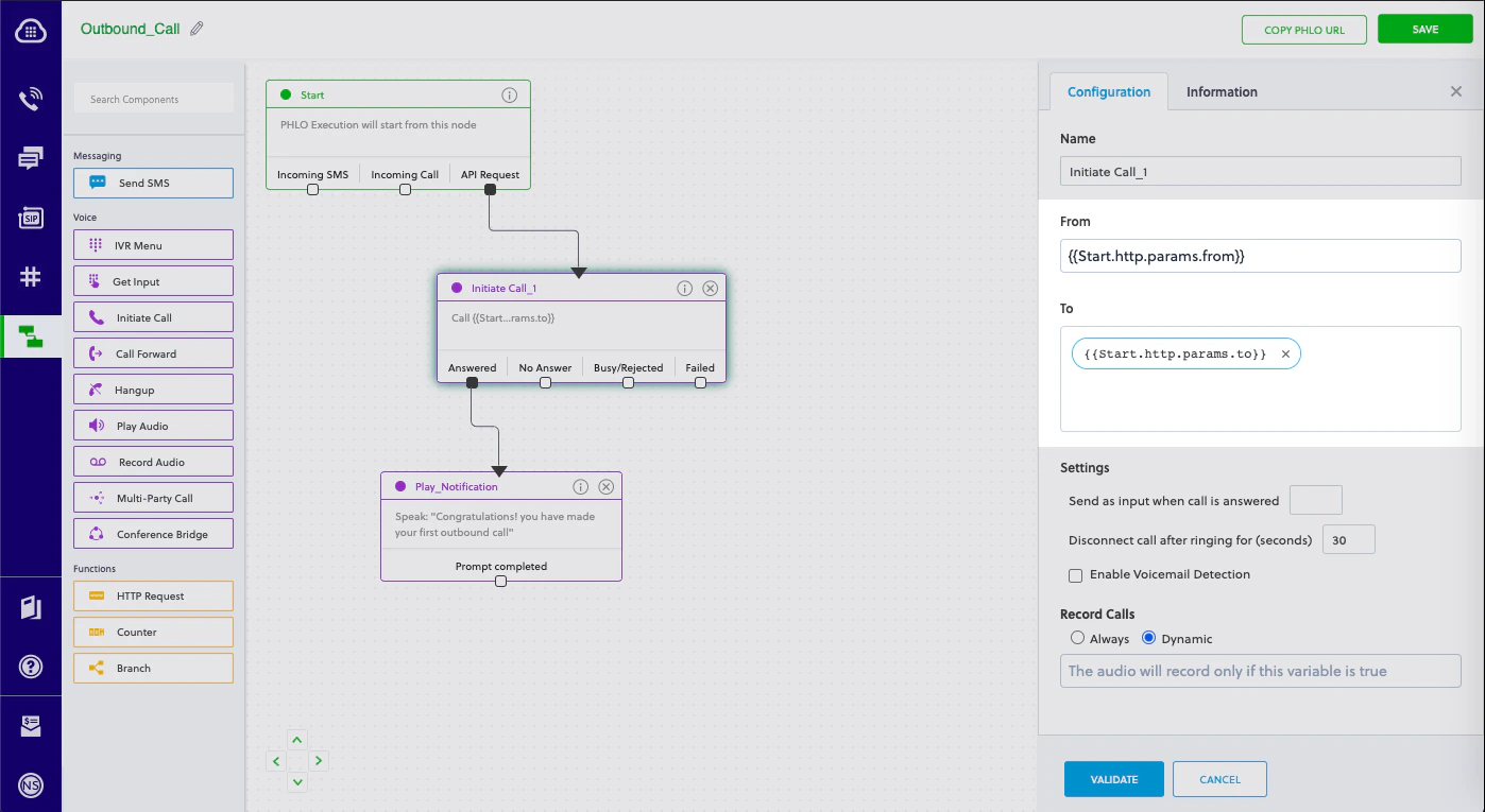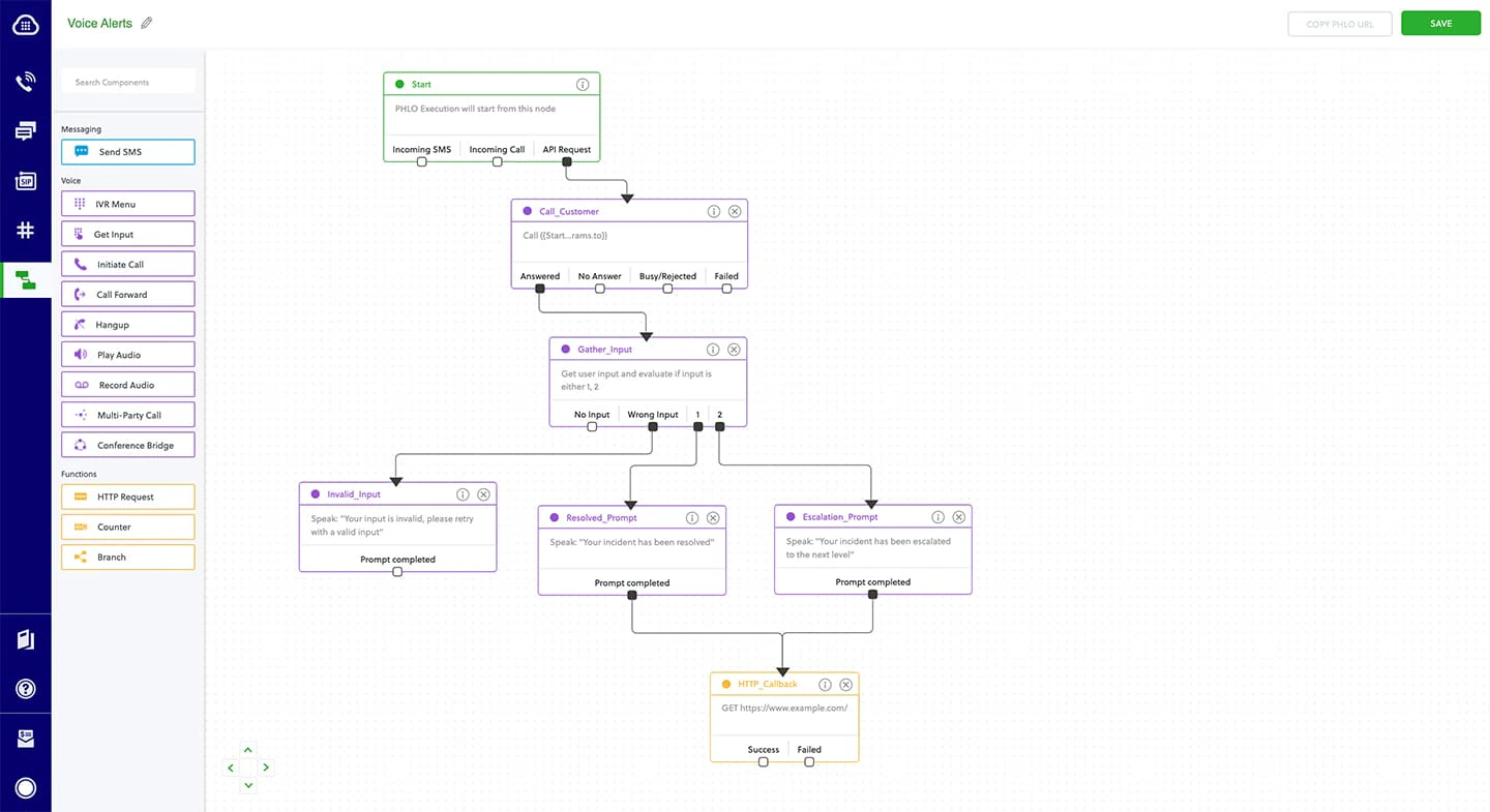 This guide shows how to make voice calls to alert customers to critical issues that require immediate attention. You can play recorded audio when the call recipient answers or use text-to-speech. You can then take action based on a dialpad key they press in response. You can set different actions if the call is not answered, if the line is busy, or if you reach voicemail.You can send voice alerts either by using our PHLO visual workflow builder or our APIs and XML documents. Follow the instructions in one of the tabs below.- Using PHLO