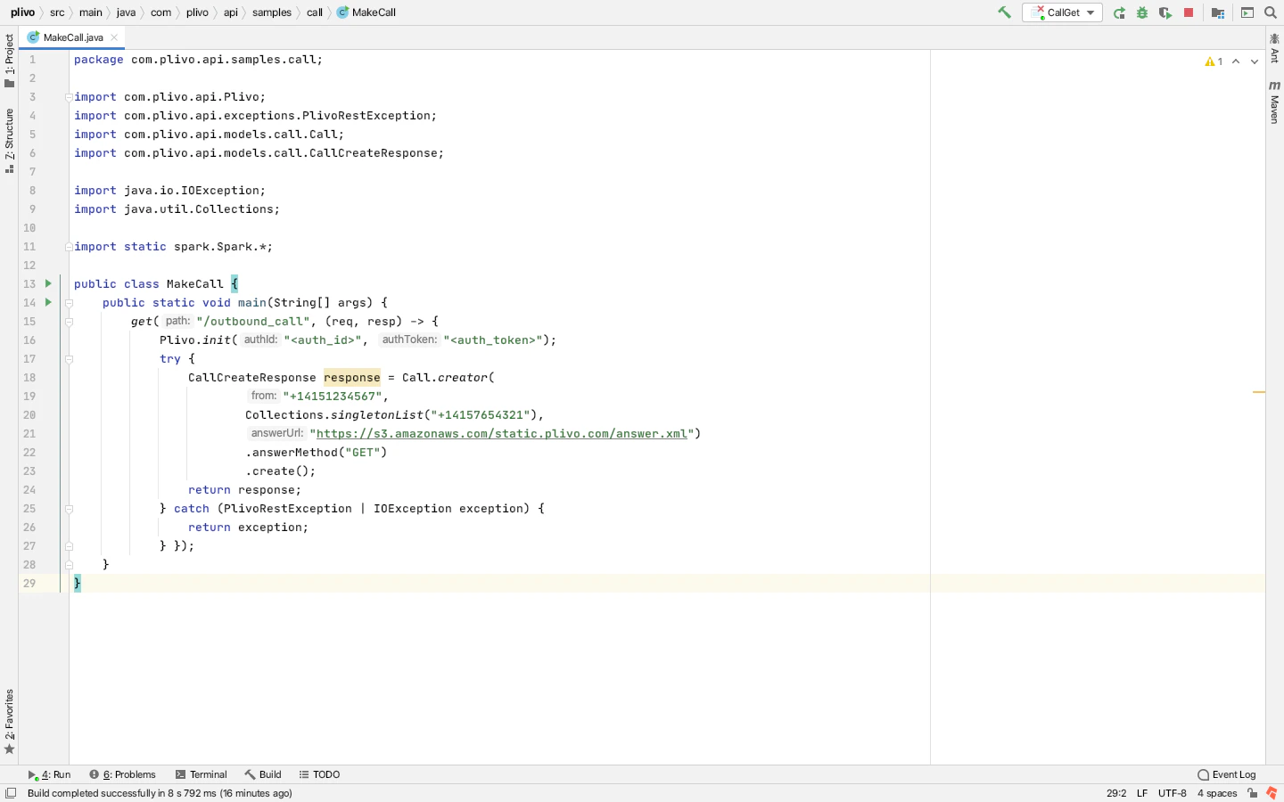 Create a Java class in the project calledMakeCall and paste into it this code.Copy