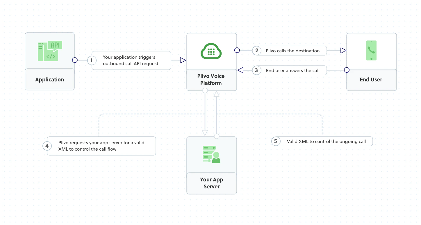 Plivo requests an answer URL when the call is answered (step 4) and expects the file at that address to hold a valid XML response from the application with instructions on how to handle the call. To see how this works, you can use https://s3.amazonaws.com/static.plivo.com/alert.xml as an answer URL to test your first outgoing call. The file contains this XML code:This code instructs Plivo to say, “Your database is out of memory. Press 1 to resolve or 2 to escalate” to the call recipient. You can find the entire list of valid Plivo XML verbs in our XML Reference documentation.Replace the auth placeholders with your authentication credentials from the Plivo console. Replace the phone number placeholders with actual phone numbers in E.164 format (for example, +12025551234).
