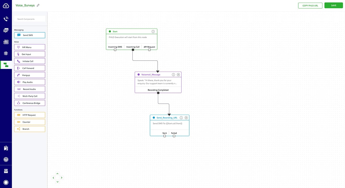 You can now call your Plivo phone number and see how the voicemail PHLO works.For more information about creating a PHLO application, see the PHLO Getting Started guide. For information on components and their variables, see the PHLO Components Library.How it works