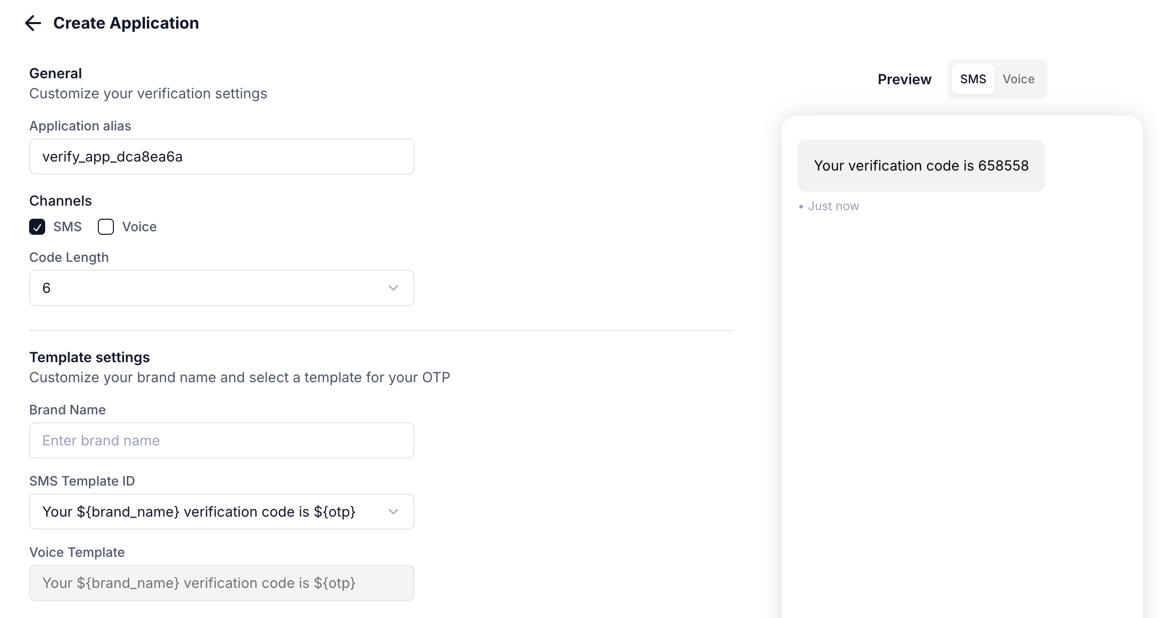 To start sending OTPs, create a Verify application in the Plivo Console.Configure these settings: