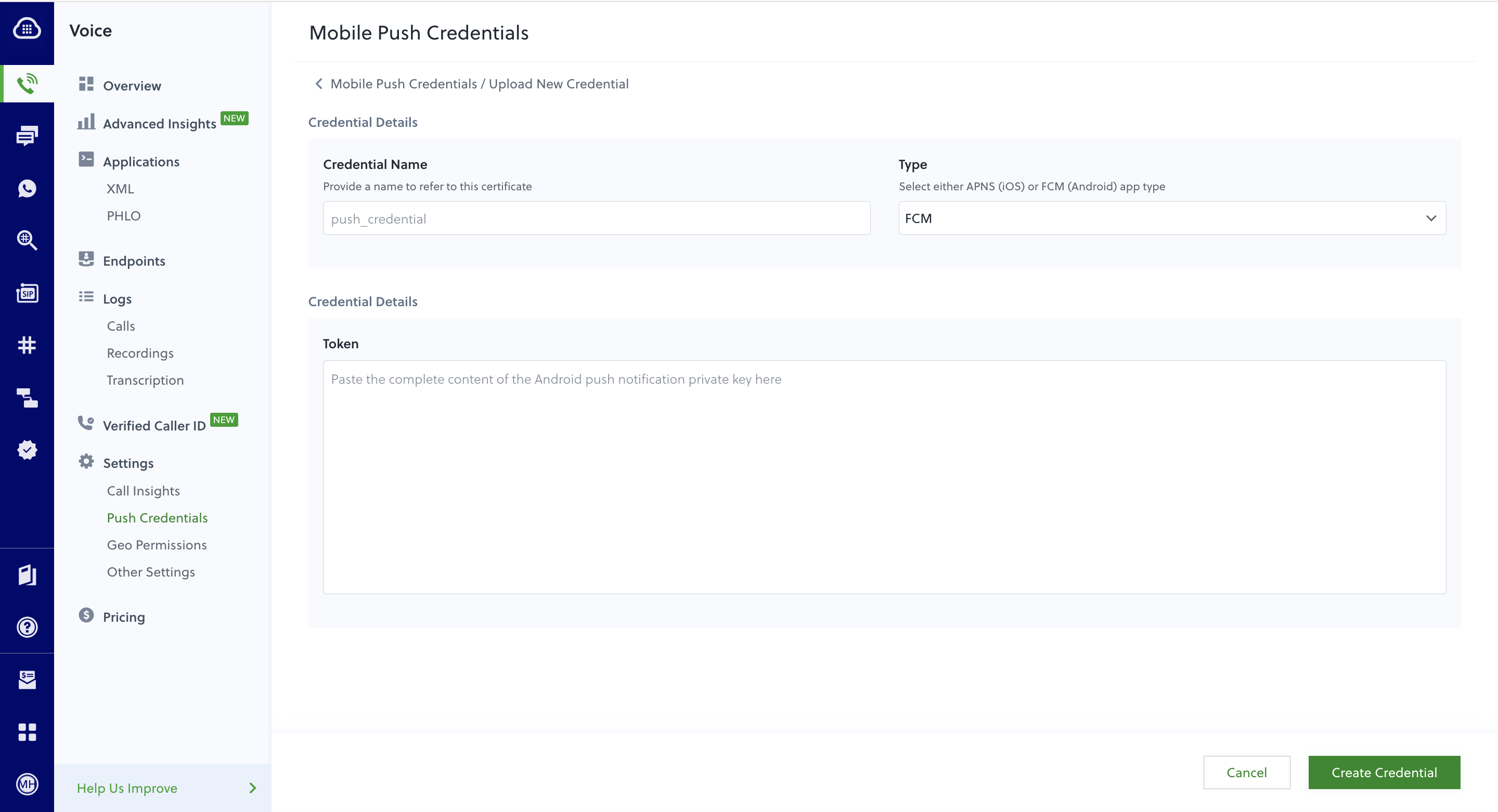 You can manage both iOS and Android push credentials in the console at Voice > Push Credentials. iOS uses the APNS certificate type and Android uses the FCM certificate type. You can upload up to 10 certificates per account on the console.Adding an iOS push credential
